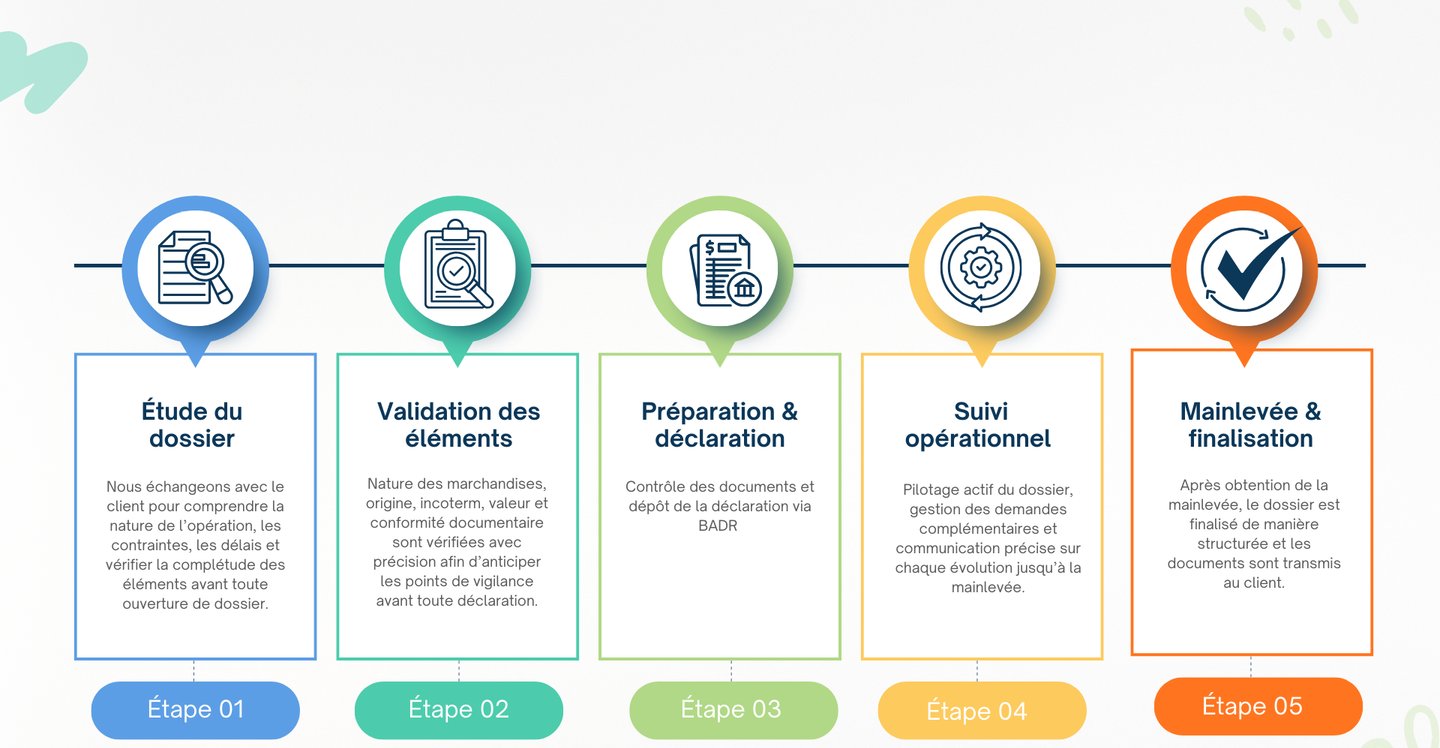 Gestion et suivi de vos déclarations douanières via le système BADR avec un contrôle rigoureux et conforme.